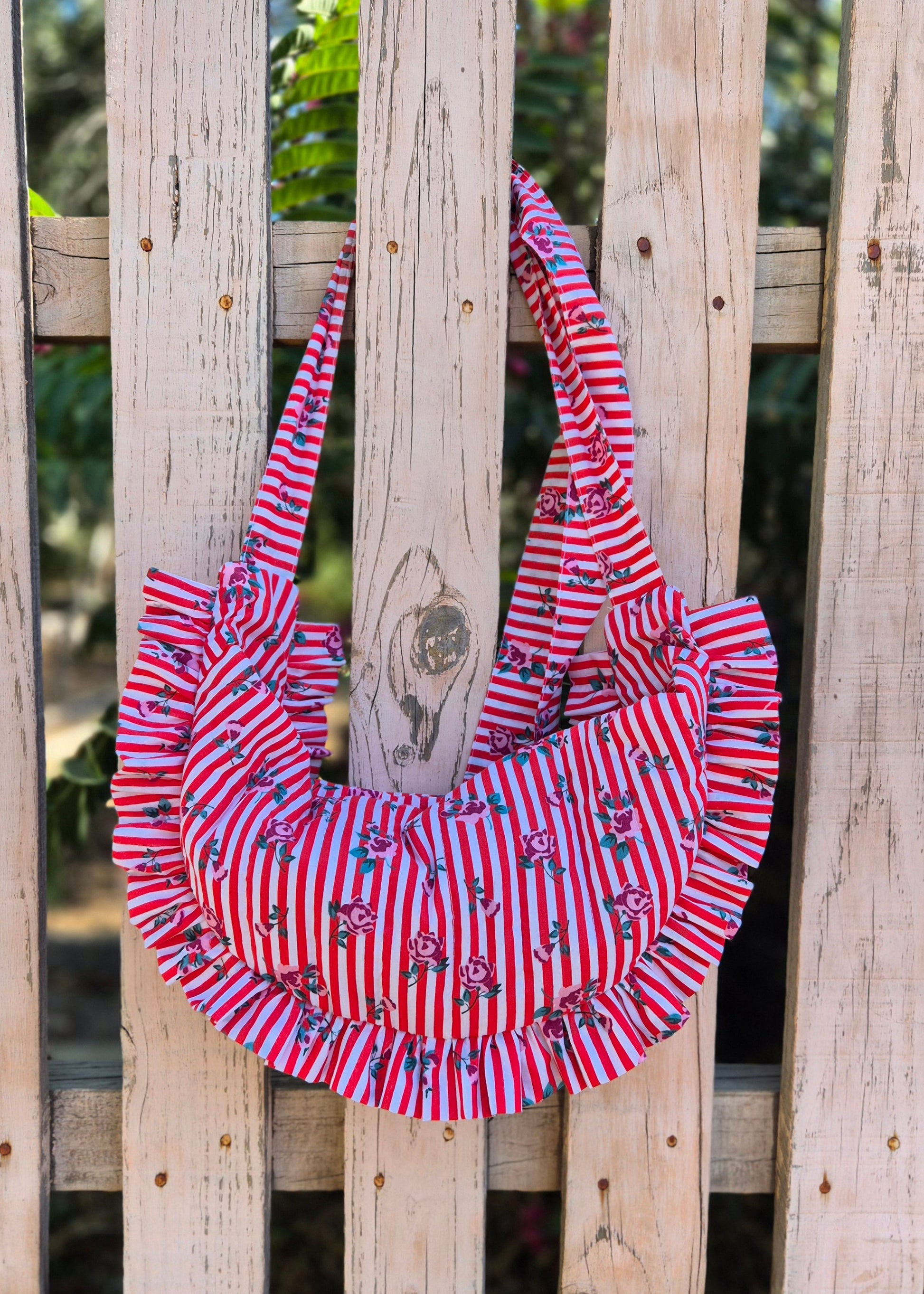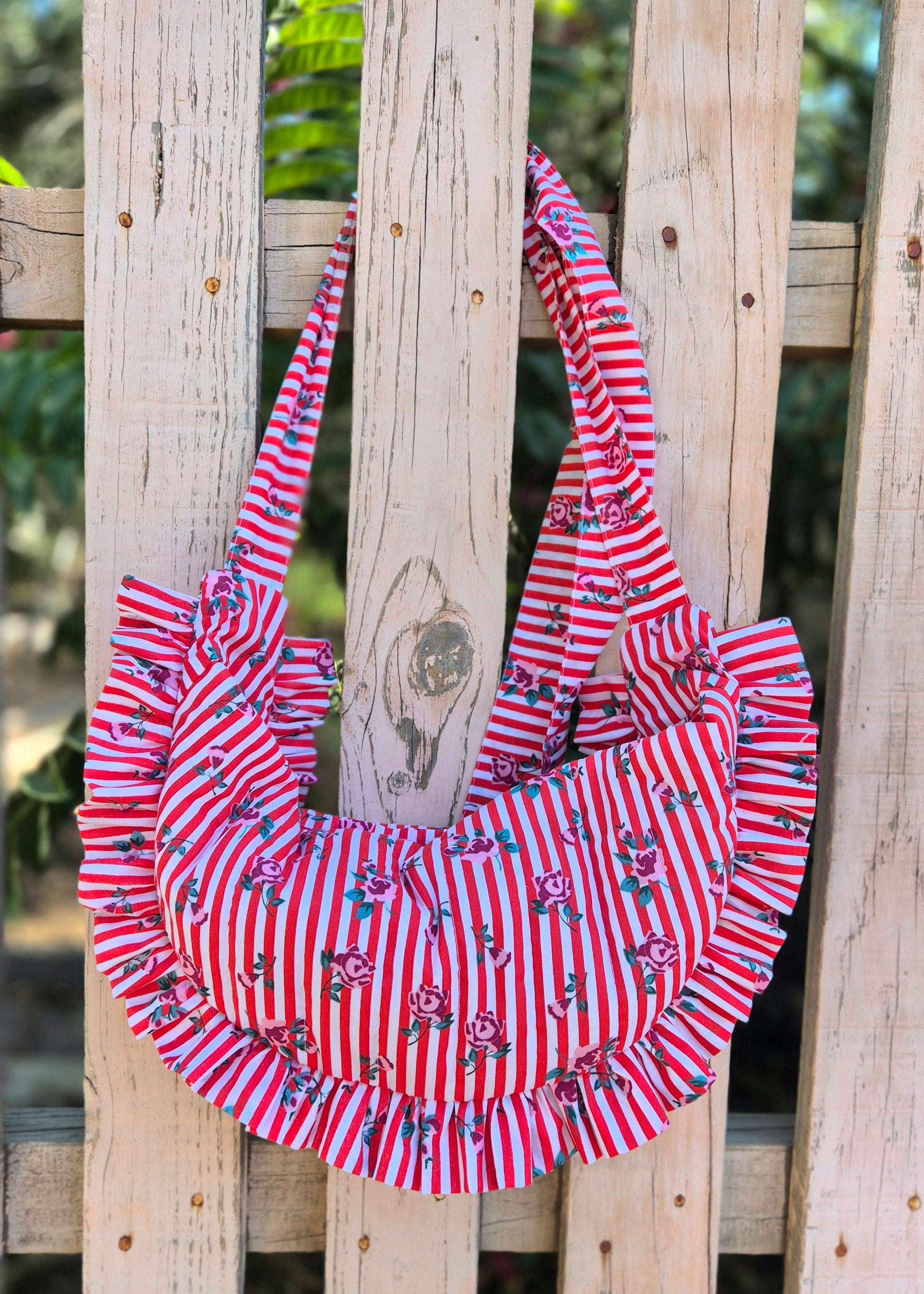 Cartera acolchada de popelina de algodón, con un diseño estampado de rayas y flores. Tiene una linda forma de media luna y volantes en todo el borde que la hacen única.