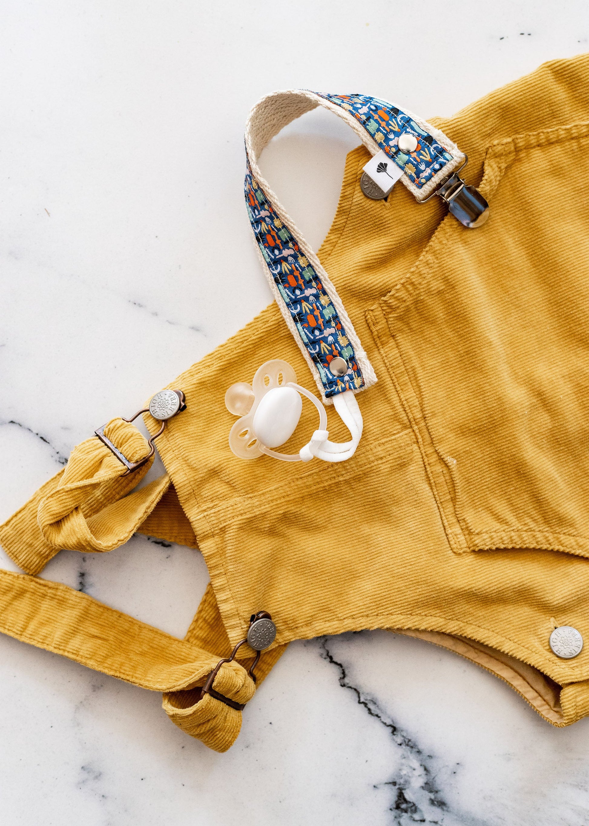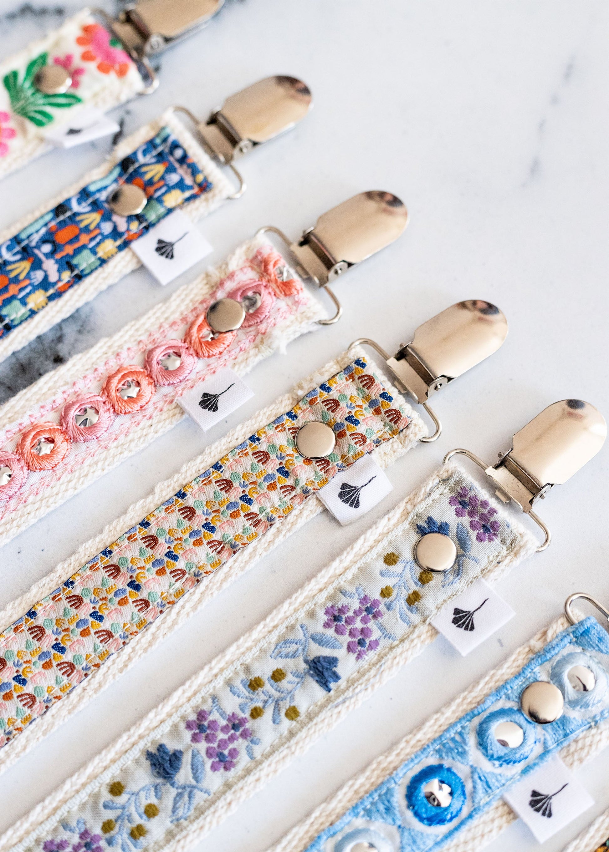 Portachupetes con base 100% algodón y cinta a elección, de 25 cm de largo total (incluyendo broche y elástico).